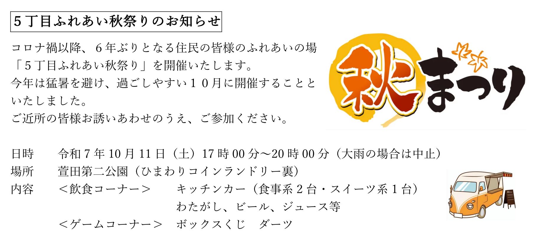 【お知らせ】5丁目ふれあい秋祭りについて お知らせ 2025.10.10 この記事は約1分で読めます。 【お知らせ】 10月11日(土)開催予定の「5丁目ふれあい秋祭り」は、大雨とならない限り開催いたします。皆さまのご来場お待ちしております。※天候が急変した場合は、安全を最優先し、急遽中止とする場合があります。 その場合は、本ホームページにてお知らせします。